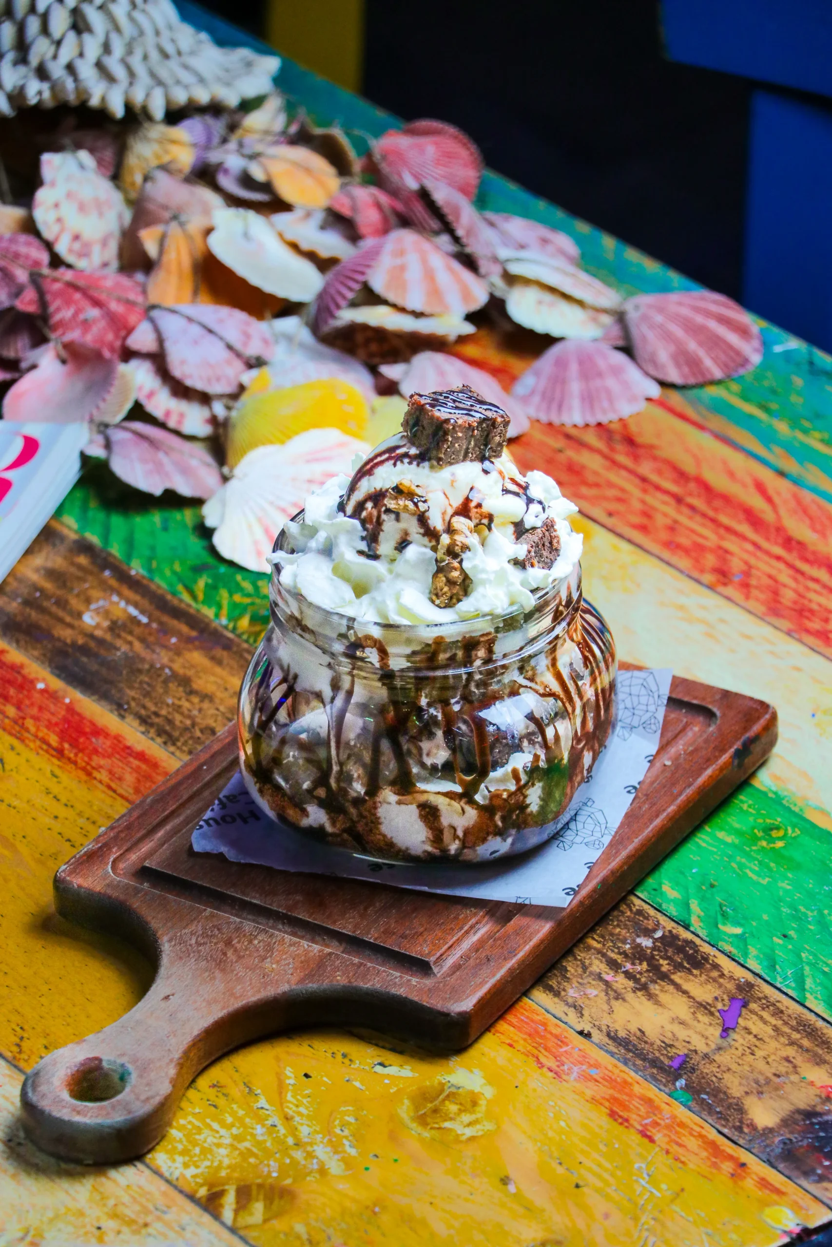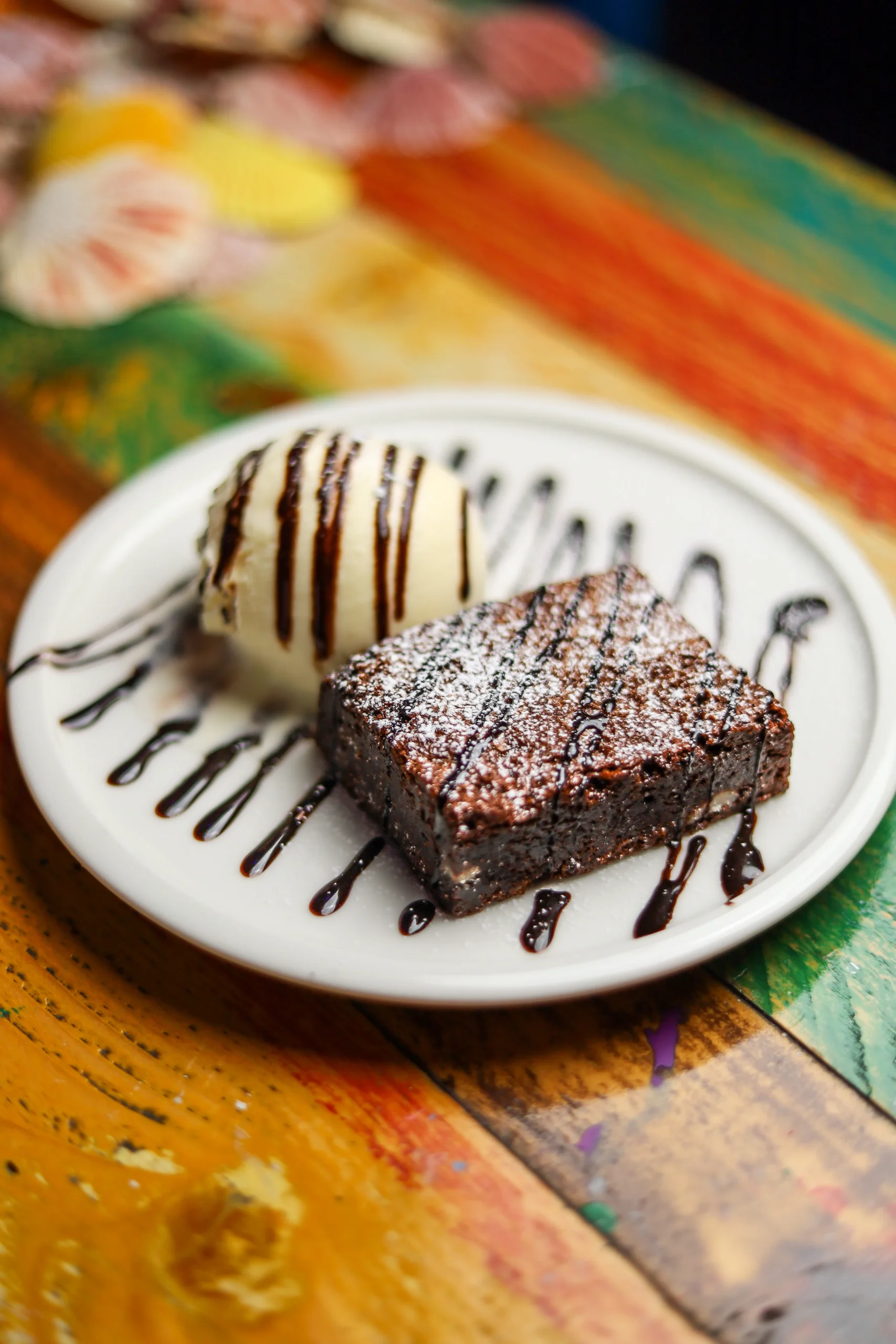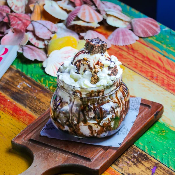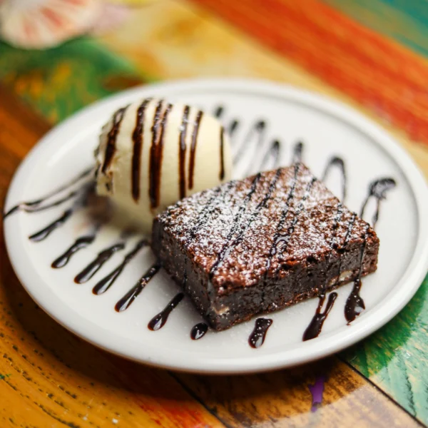 Creamy vanilla ice cream topped with bits of decadent brownie, rich chocolate sauce and whipped cream.