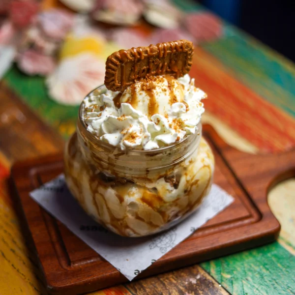 Creamy vanilla ice cream topped with crumbled Lotus Biscoff biscuits and a swirl of whipped cream.