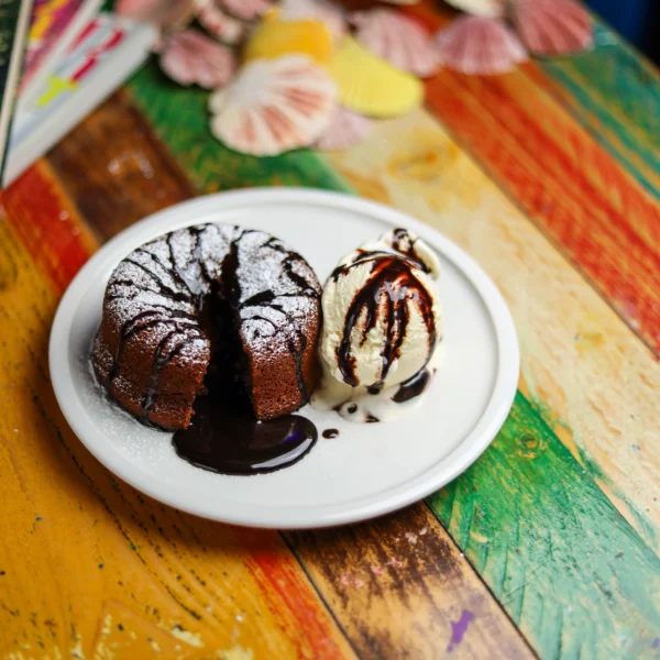 A warm chocolate cake with a gooey, melted centre. Served with vanilla ice cream.