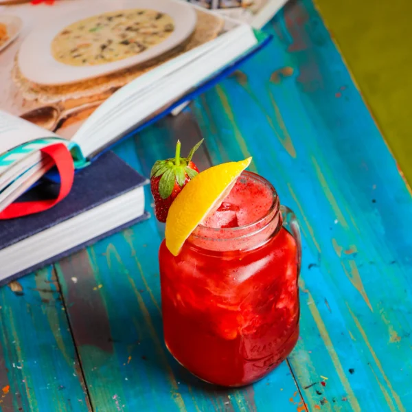 Three pieces of pancakes served with fresh berries and maple syrup or honey.